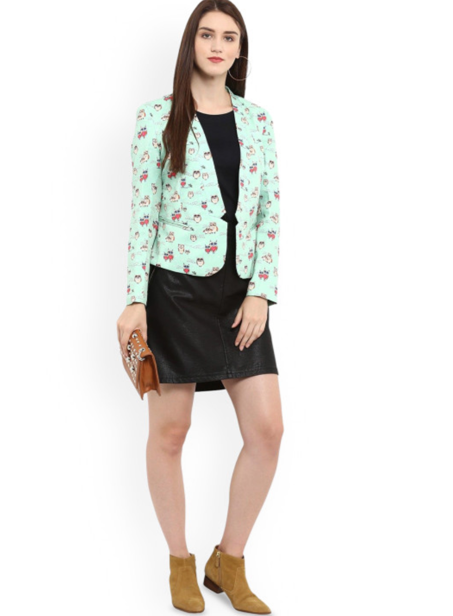 Green & red printed tailored-fit casual blazer, has a notched lapel, long sleeves, front open closure, two flap pockets, and a ventless back hem
