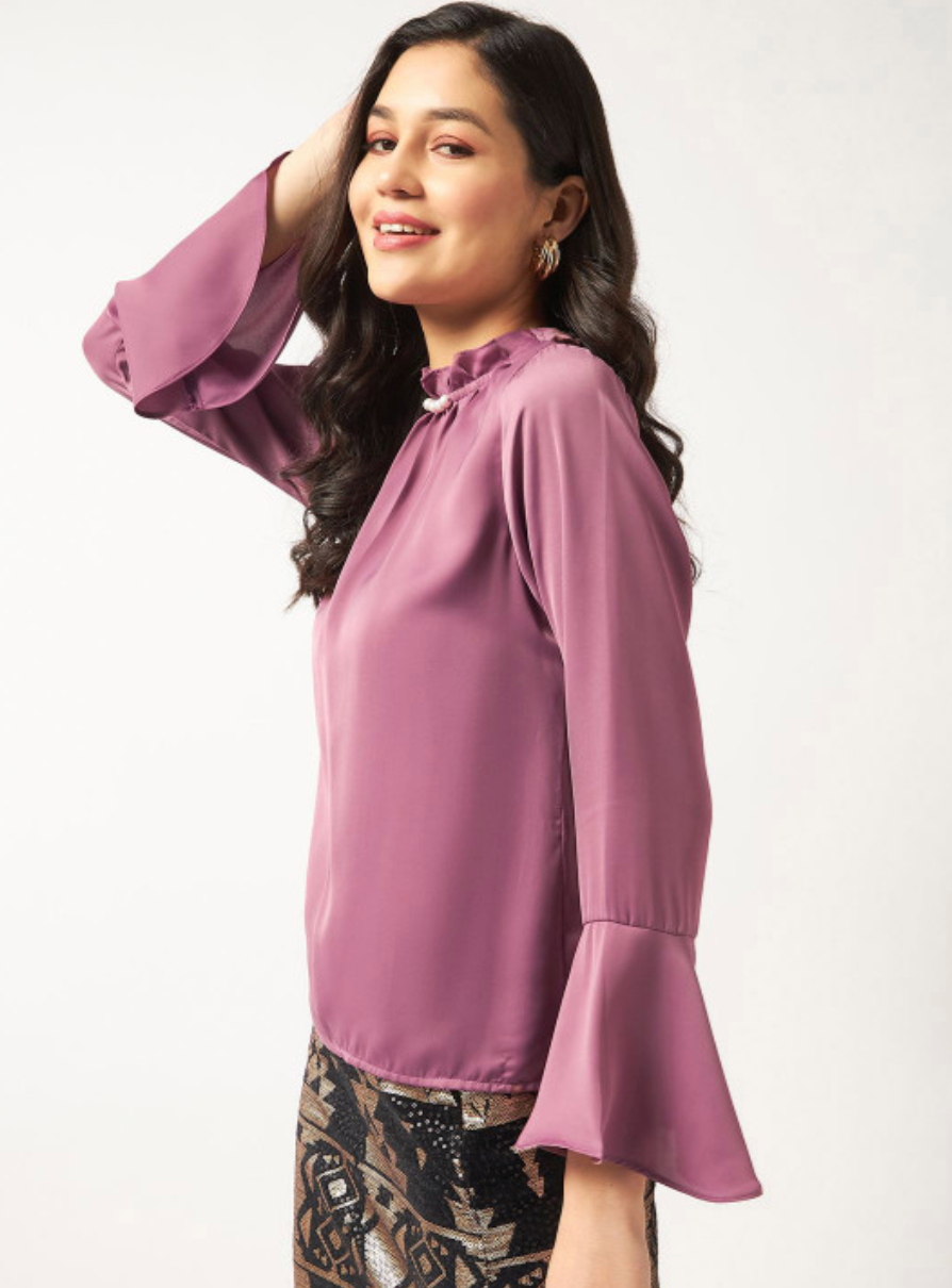 Taupe regular top, Solid, Round neck, long, bell sleeves, Pearls details, Woven crepe