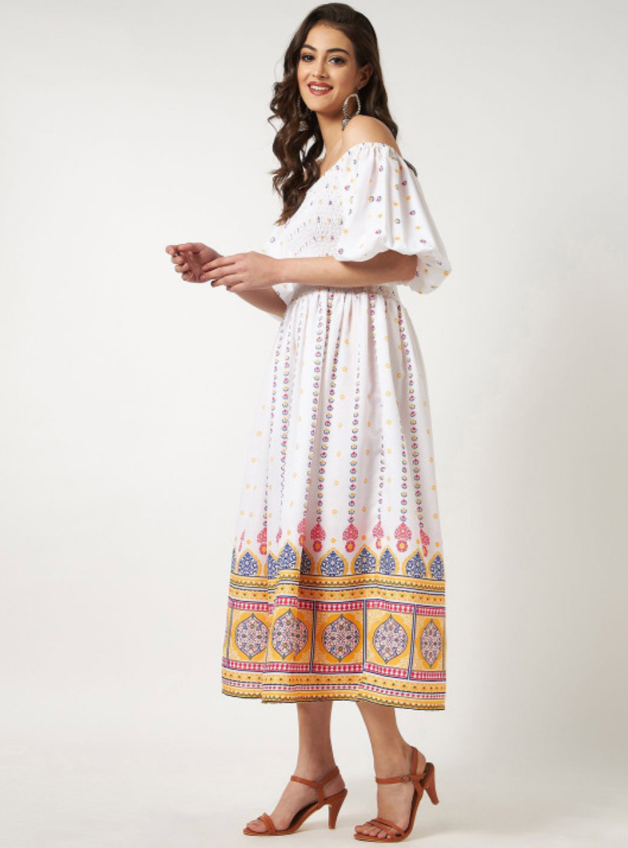 White ethnic motifs print fit & flare dress, Off-shoulder, Short, regular sleeves, Midi length in flared hem, Crepe fabric, Zip closure