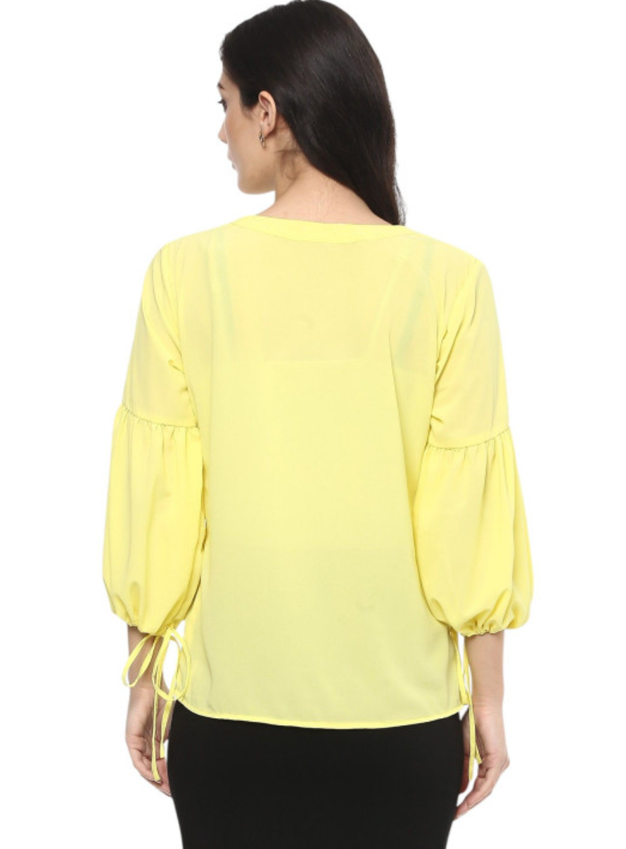 Yellow shirt style top, Solid, V-neck, three-quarter, puff sleeves, Woven crepe, Button closure